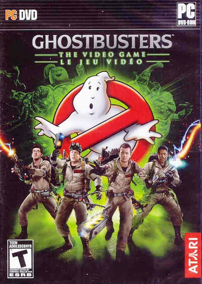Image: The front cover of the Ghostbusters: The Video Game PC DVD-ROM. It features the iconic Ghostbusters logo with the four main characters and the new recruit standing in front of a spectral New York City skyline.
