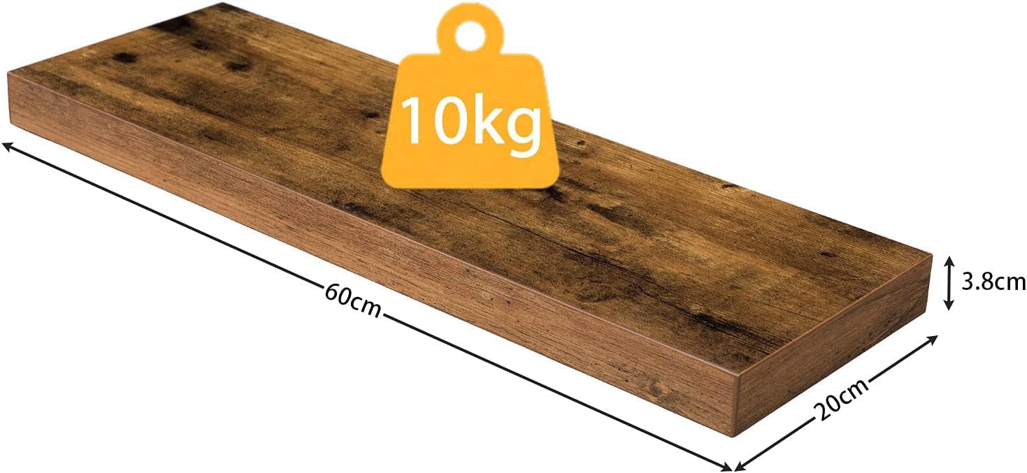 These rustic brown floating shelves are designed to offer both practical storage and decorative display space in various rooms of your home, including the bathroom, bedroom, kitchen, office, and living room. Each shelf measures 60 x 20 x 3.8 cm (L x W x H) and can support up to 10 kg.
