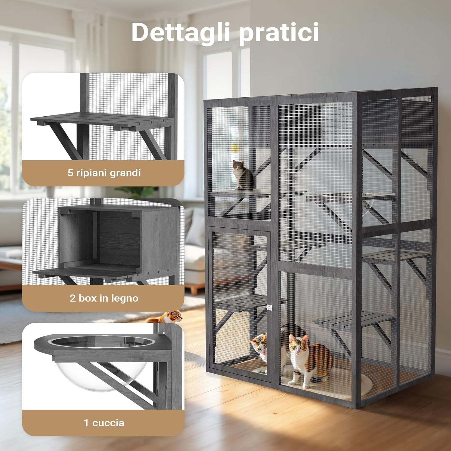 Image: Interior details of the enclosure, highlighting the five large shelves, two wooden boxes, and a cat bed for resting.