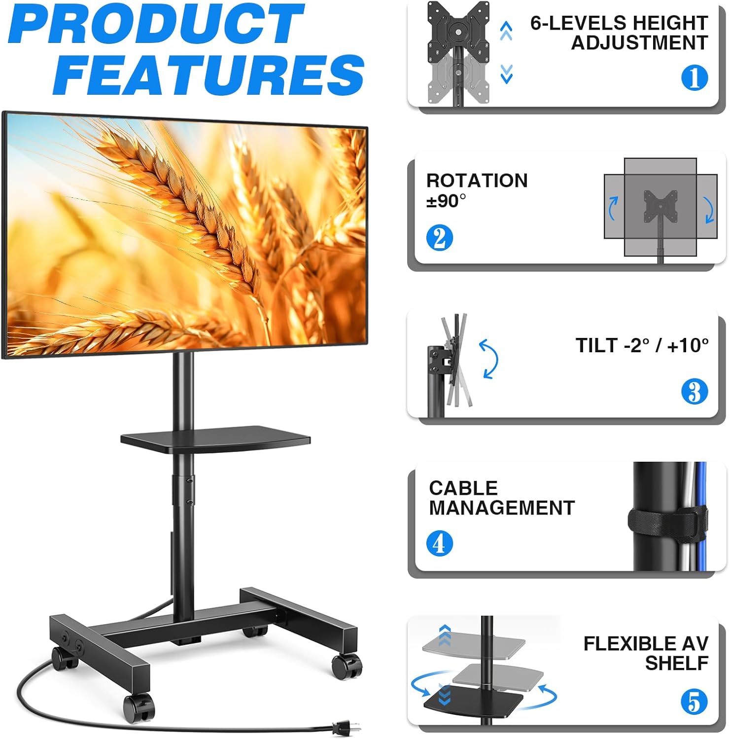 Ta videoposnetek ponuja vizualni pregledview of the Rfiver Rolling TV Stand's features, including height adjustment, adjustable storage shelf, 90-degree vertical assembly, tilt functionality, cable management, integrated power outlet, and VESA compatibility.